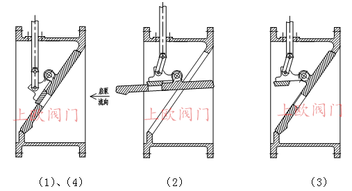 2、關(guān)閥:停泵瞬間,閥門進(jìn)口流量及壓力突然降低,大閥板在重力作用下迅速關(guān)閉(閥板與閥座接觸前,設(shè)有緩沖機(jī)構(gòu),保護(hù)密封面),截?cái)啻蟛糠炙,小閥板在控制腔作用下自動(dòng)開啟泄除回流壓力水,削減水錘峰值,如圖(3)示;同時(shí),一部分回流水通過旁通管道進(jìn)入控制腔上腔,推動(dòng)控制桿下行,關(guān)閉小閥板至完全切斷介質(zhì),如圖(4):示。關(guān)閥時(shí)間可通過旁通管道上的調(diào)節(jié)閥調(diào)節(jié),使水錘峰值在控制范圍內(nèi)。